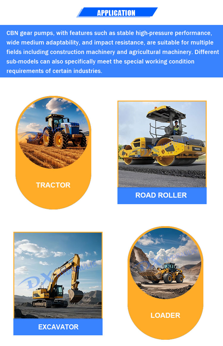 CBN齿轮泵具有高压性能稳定、介质适应性广、抗冲击等特点,适用于工程机械、农业机械等多个领域。不同的子型号还可以满足特定行业的特殊工况需求。