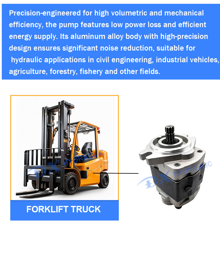 作为高压液压齿轮泵,它提供稳定的流体动力输出,支持平稳的举升、转向和辅助功能,帮助叉车即使在繁重的工作负载下也能高效运行。这种稳定性有助于减少振动,减少液压部件的磨损,并有助于延长使用寿命。该泵还易于操作,因为其简单的设计可以简化安装、方便维护并与标准叉车液压系统快速集成。操作员和技术人员可以管理日常检查或更换,无需专门的工具或复杂的程序。在实用性方面,SGP2齿轮泵与多种叉车型号和工况具有广泛的兼容性。其可靠的性能支持日常仓库操作和更密集的工业任务。